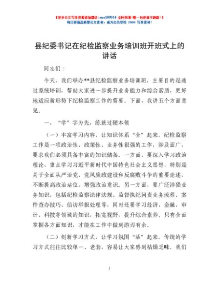 / 县纪委书记在纪检监察业务培训班开班式上的讲话