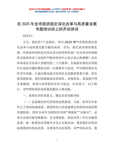 / 在2025年全市国资国企深化改革与高质量发展专题培训班上的开班讲话