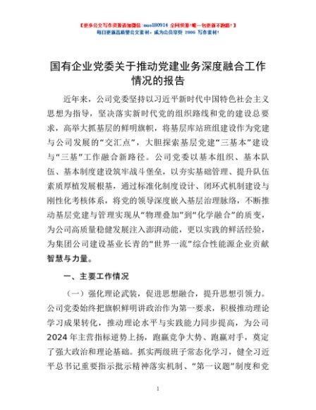 / 国有企业党委关于推动党建业务深度融合工作情况的报告