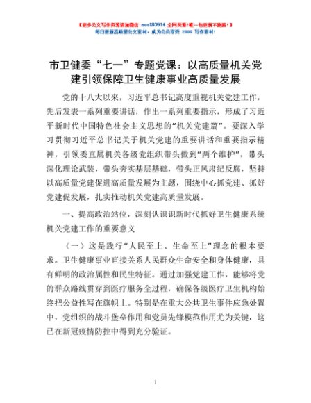 市卫健委“七一”专题党课:以高质量机关党建引领保障卫生健康事业高质量发展
