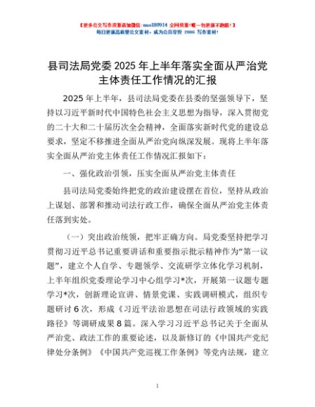 / 县司法局党委2025年上半年落实全面从严治党主体责任工作情况的汇报