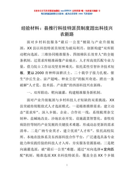 / 经验材料:县推行科技特派员制度 蹚出科技兴农新路
