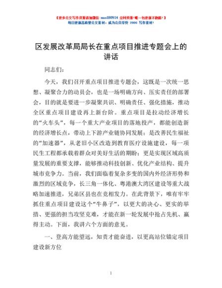 / 区发展改革局局长在重点项目推进专题会上的讲话