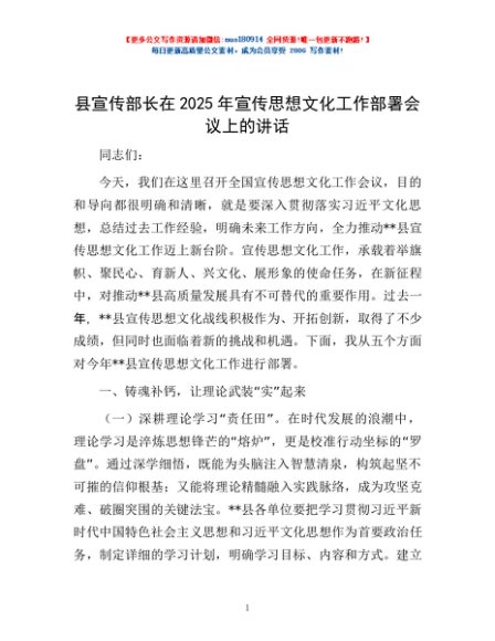 / 县宣传部长在2025年宣传思想文化工作部署会议上的讲话
