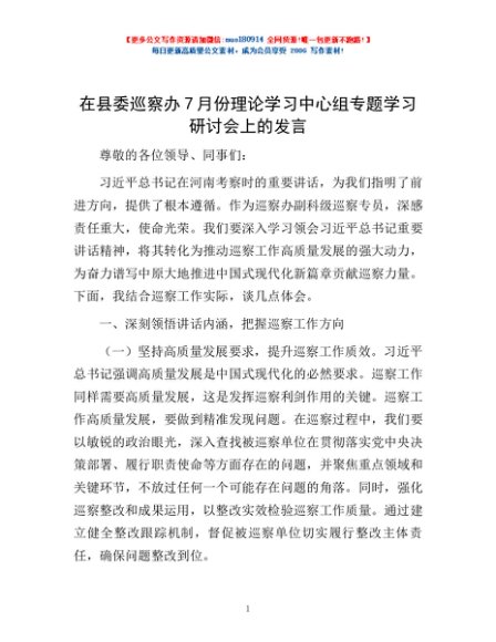 / 在县委巡察办7月份理论学习中心组专题学习研讨会上的发言