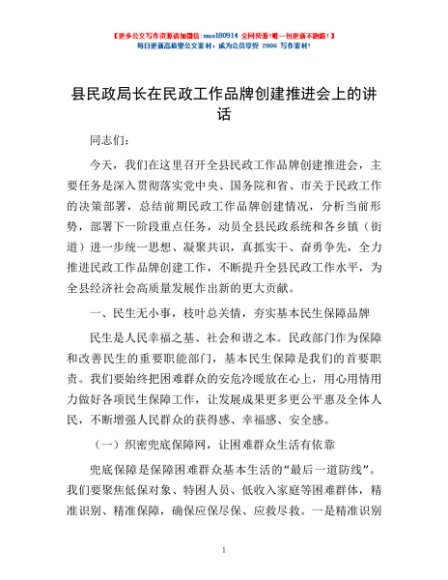 / 县民政局长在民政工作品牌创建推进会上的讲话