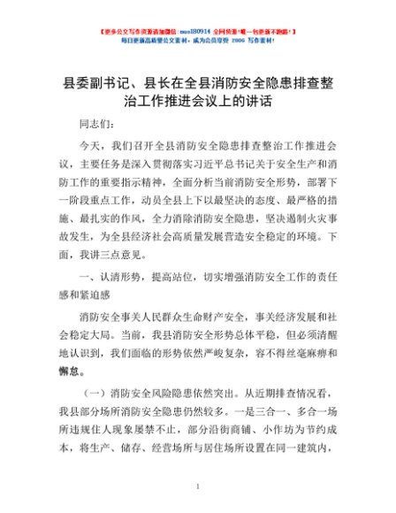 / 县委副书记、县长在全县消防安全隐患排查整治工作推进会议上的讲话