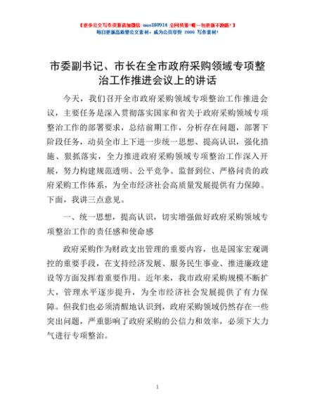 / 市委副书记、市长在全市政府采购领域专项整治工作推进会议上的讲话