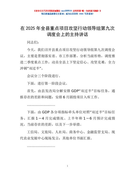 / 在2025年全县重点项目攻坚行动领导组第九次调度会上的主持讲话