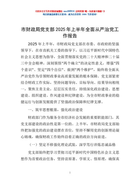/ 市财政局党支部2025年上半年全面从严治党工作报告