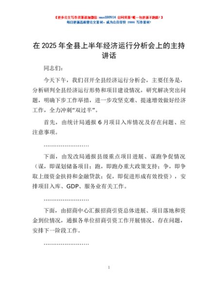 / 在2025年全县上半年经济运行分析会上的主持讲话