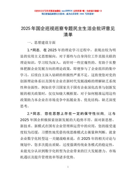 / 2025年国企巡视巡察专题民主生活会批评意见清单