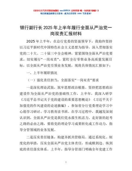 / 银行副行长2025年上半年履行全面从严治党一岗双责汇报材料
