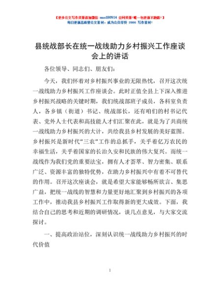 / 县统战部长在统一战线助力乡村振兴工作座谈会上的讲话