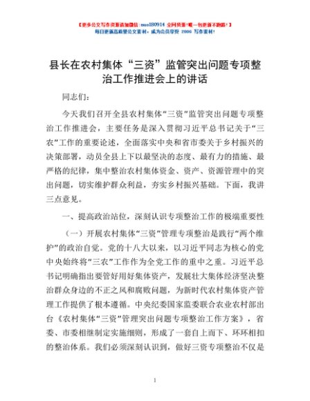/ 县长在农村集体“三资”监管突出问题专项整治工作推进会上的讲话