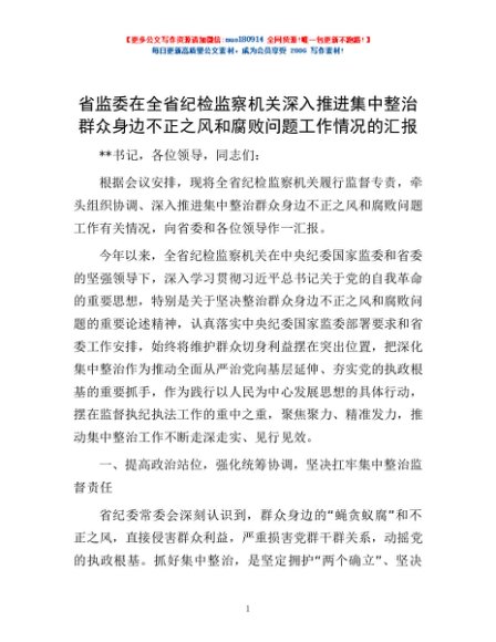 / 省监委在全省纪检监察机关深入推进集中整治群众身边不正之风和腐败问题工作情况的汇报