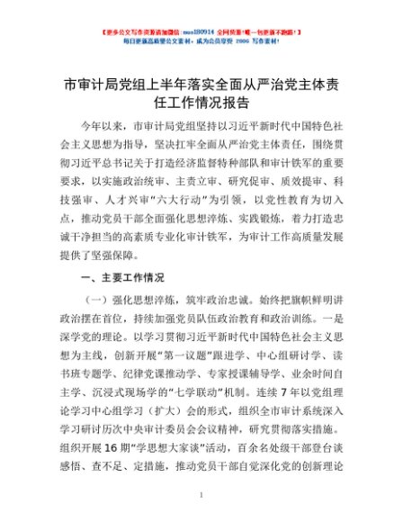 / 市审计局党组上半年落实全面从严治党主体责任工作情况报告