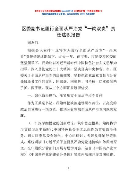 / 区委副书记履行全面从严治党“一岗双责”责任述职报告