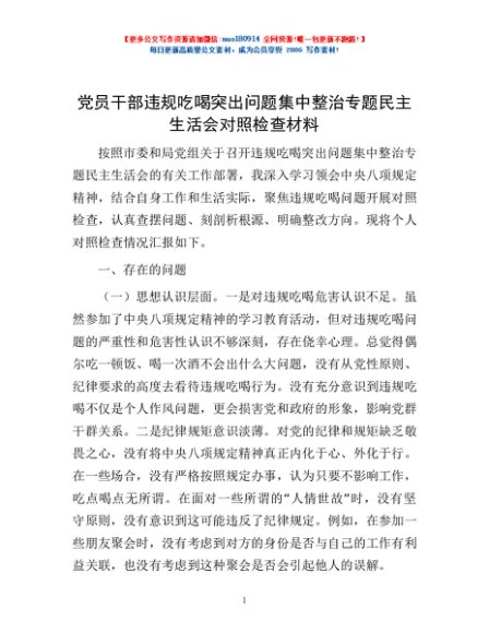 / 党员干部违规吃喝突出问题集中整治专题民主生活会对照检查材料