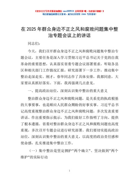 / 在2025年群众身边不正之风和腐败问题集中整治专题会议上的讲话