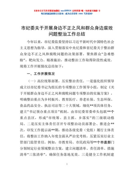 / 市纪委关于开展身边不正之风和群众身边腐败问题整治工作总结