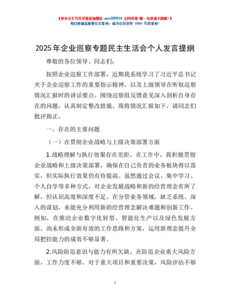 / 2025年企业巡察专题民主生活会个人发言提纲