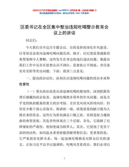 / 区委书记在全区集中整治违规吃喝警示教育会议上的讲话