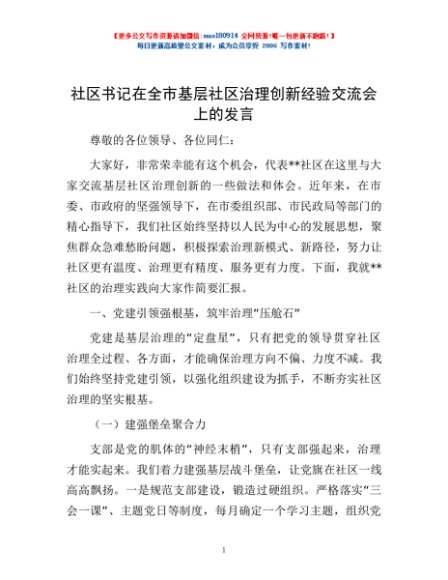 / 社区书记在全市基层社区治理创新经验交流会上的发言