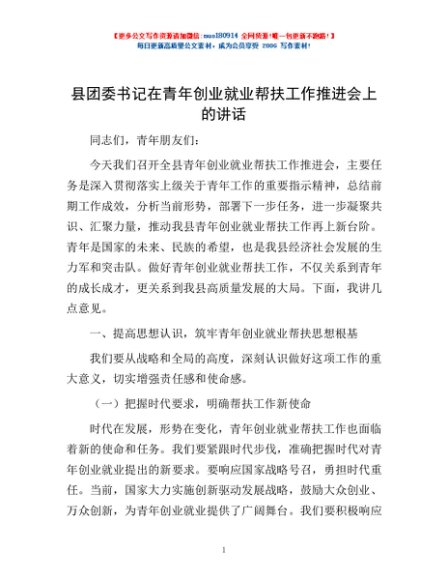 / 县团委书记在青年创业就业帮扶工作推进会上的讲话