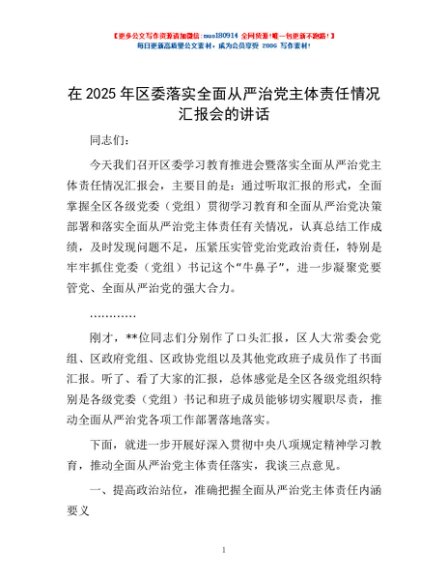 / 在2025年区委落实全面从严治党主体责任情况汇报会的讲话