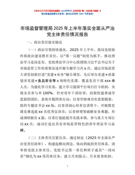/ 市场监督管理局2025年上半年落实全面从严治党主体责任情况报告