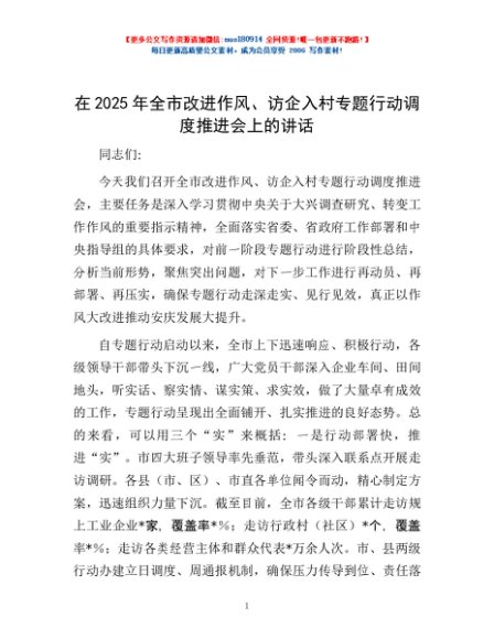 / 在2025年全市改进作风、访企入村专题行动调度推进会上的讲话