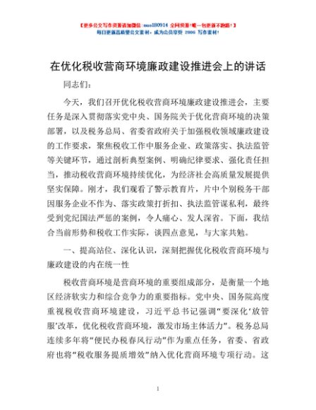 / 在优化税收营商环境廉政建设推进会上的讲话