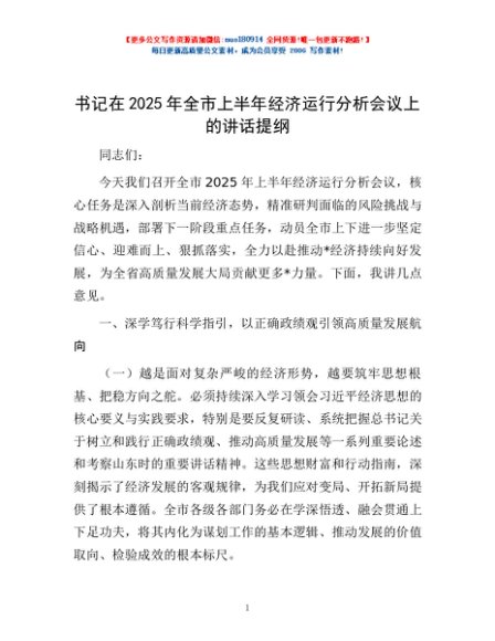 / 书记在2025年全市上半年经济运行分析会议上的讲话提纲