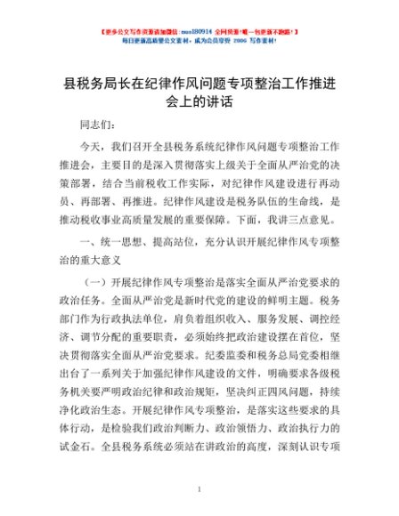 / 县税务局长在纪律作风问题专项整治工作推进会上的讲话