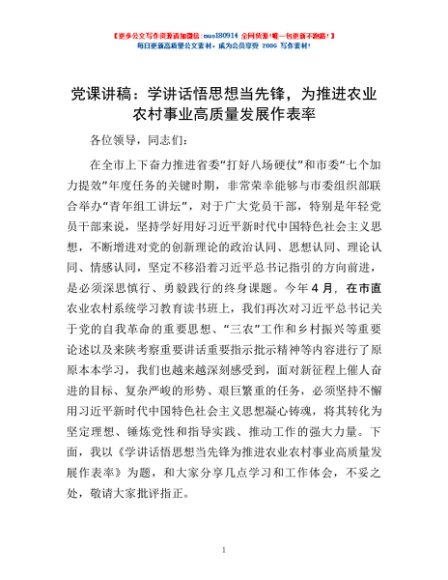 / 党课讲稿:学讲话悟思想当先锋,为推进农业农村事业高质量发展作表率