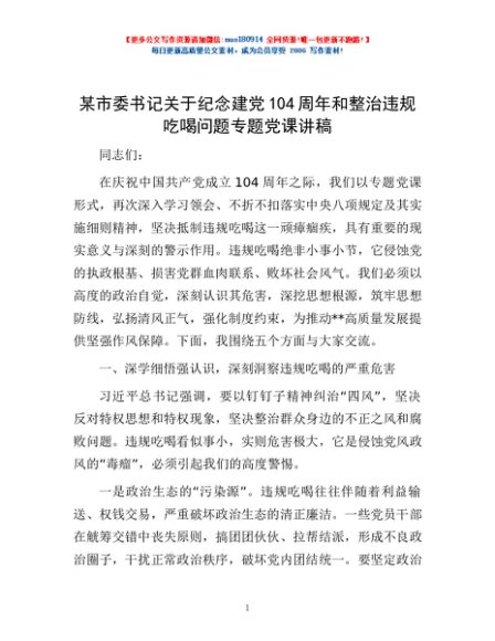 / 某市委书记关于纪念建党104周年和整治违规吃喝问题专题党课讲稿