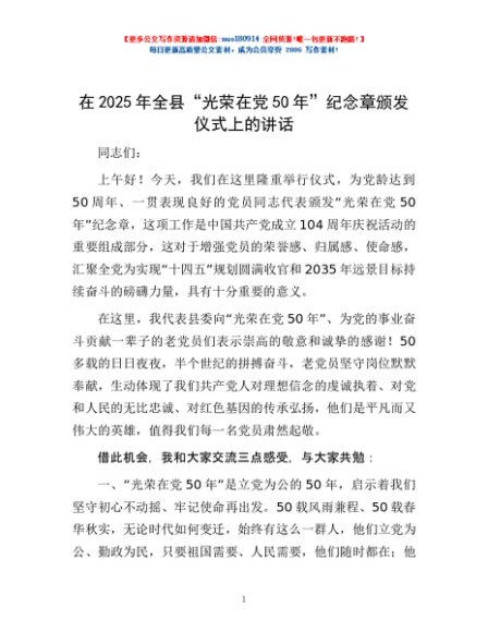 / 在2025年全县“光荣在党50年”纪念章颁发仪式上的讲话