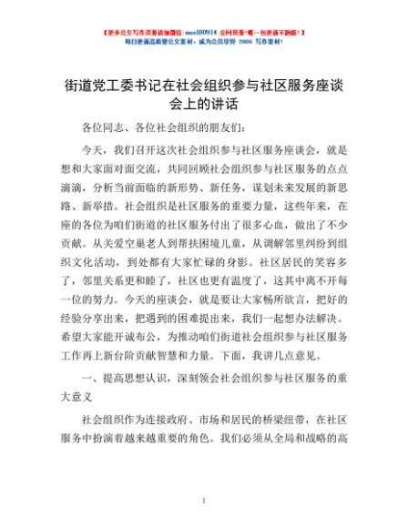 / 街道党工委书记在社会组织参与社区服务座谈会上的讲话