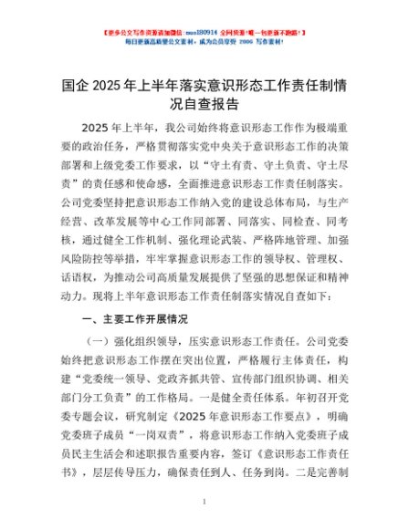 / 国企2025年上半年落实意识形态工作责任制情况自查报告