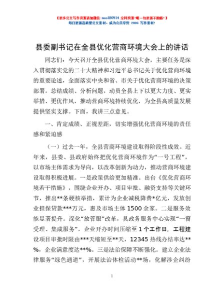 / 县委副书记在全县优化营商环境大会上的讲话