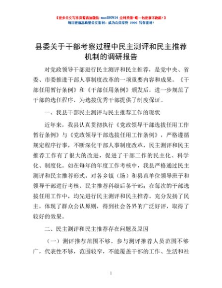 / 县委关于干部考察过程中民主测评和民主推荐机制的调研报告