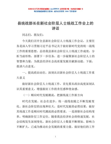 / 县统战部长在新社会阶层人士统战工作会上的讲话