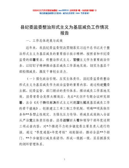 / 县纪委监委整治形式主义为基层减负工作情况报告