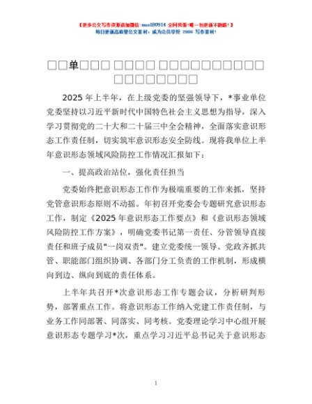 / 事业单位党委 2025 年上半年意识形态领域风险防控工作汇报