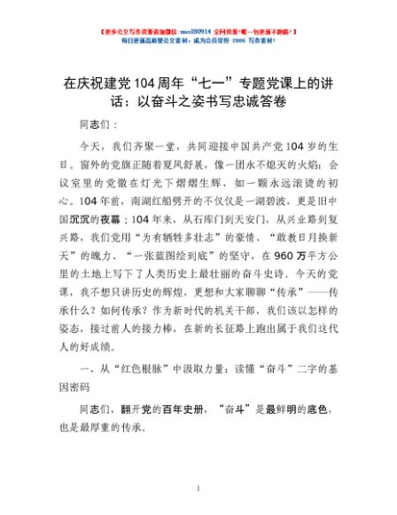 / 在庆祝建党104周年“七一”专题党课上的讲话:以奋斗之姿书写忠诚答卷