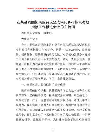 / 在某县巩固拓展脱贫攻坚成果同乡村振兴有效衔接工作推进会上的主持词