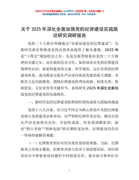 / 关于2025年深化全面加强党的纪律建设实践路径研究调研报告
