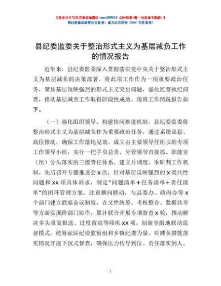 / 县纪委监委关于整治形式主义为基层减负工作的情况报告
