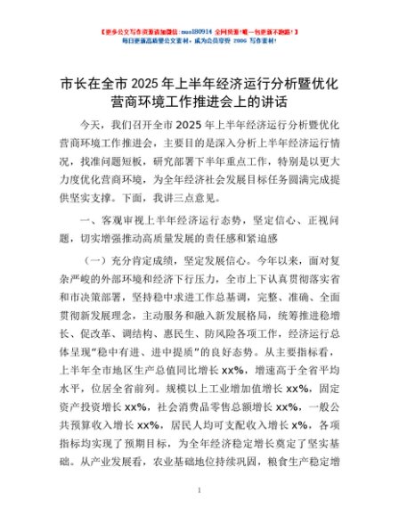/ 市长在全市2025年上半年经济运行分析暨优化营商环境工作推进会上的讲话